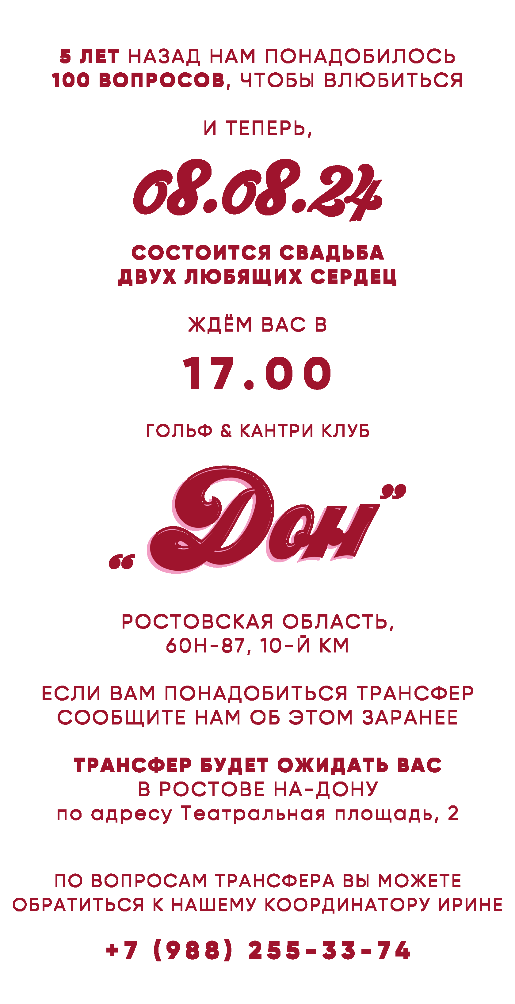 Пожалуйста, подтвердите свое присутствие до 20.07.24, чтобы мы могли спланировать нашу свадьбу наилучшим образом